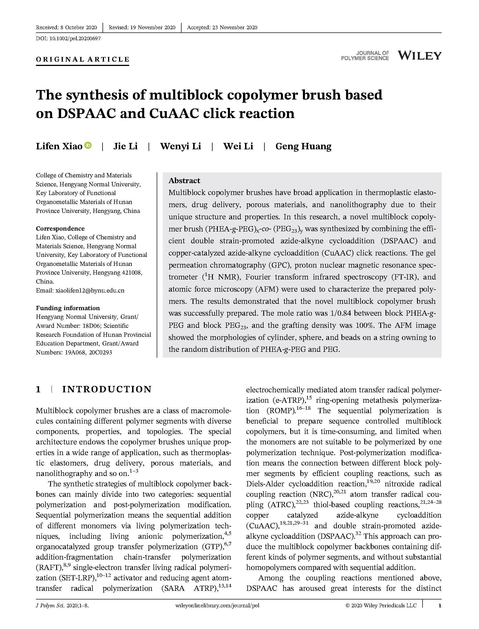 (4)Xiao Li-Fen, Li Jie, Li Wen-Yi, Li Wei, Huang Geng. The Synthesis of Multiblock Copolymer Brush Based on DSPAAC and CuAAC Click Reaction. Journal of Polymer Science, 2021, 59: 100-107.