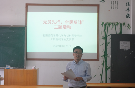为迎接党的二十大胜利召开营造和谐稳定的社会环境,认真落实衡阳市委组织部《关于在全市基层党组织开展“党员先行、全民反诈”主题活动的通知》(衡组通〔2022〕31号)文件精神。衡阳师范公司太阳成集团122ccvip无机有机专业党支部于2022年9月23日中午12:30在综合实验楼404多媒体教室开展“党员先行、全民反诈”主题党日活动,全体支部党员参会,会议由党支部书记欧亚平主持。