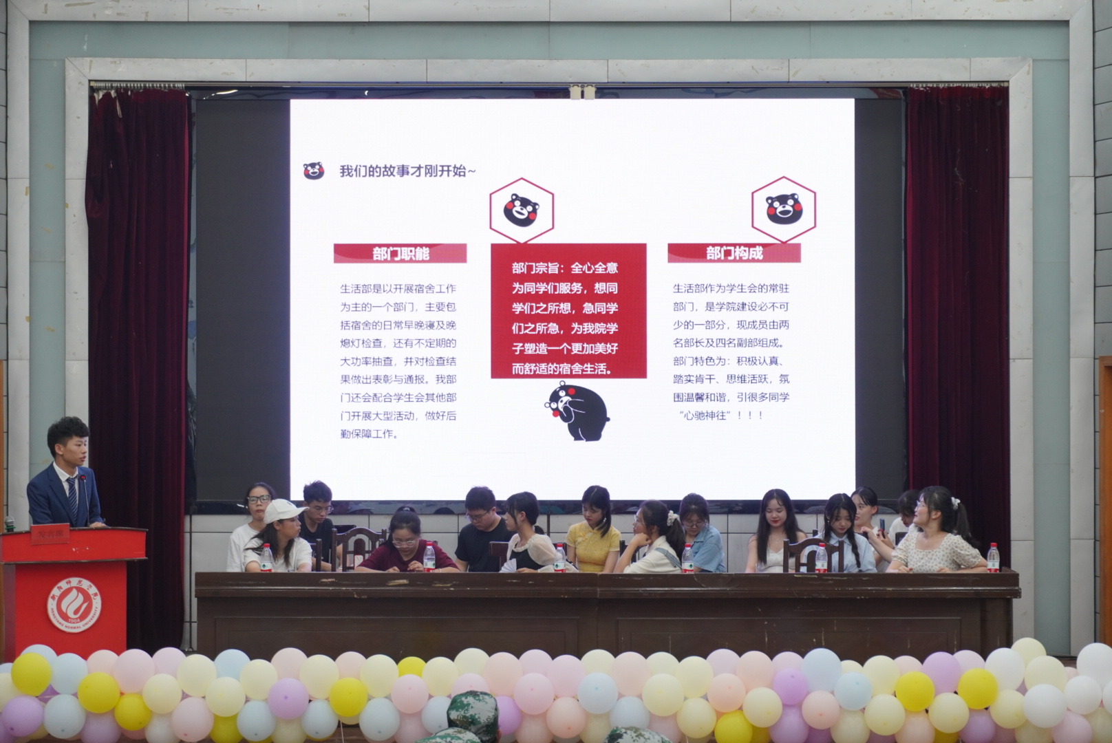 大会的第二个环节是院干招新宣讲。为吸引新生加入团委员工分会,各部门精心制作了视频与PPT,院主席团周玉林同学对团委员工分会的组成及本次招新计划进行了简要介绍,党员活动办公室及各部门都分别由负责同学向新生们介绍了各自成员、部门基本情况以及招新要求。