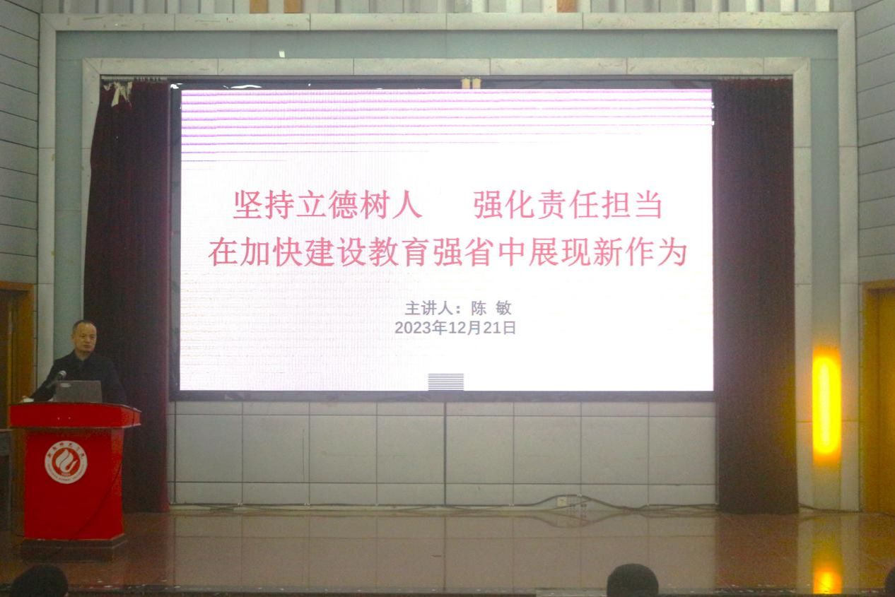 12月21日下午3点,副董事长陈敏在西校区模拟法庭主讲了题为《坚持立德树人 强化责任担当 在加快建设教育强省中展现新作为》的主题党课,以自身感悟结合当前我省教育现状,深入浅出地给公司师生上了一堂生动、深刻的党课,师生们深受教育。