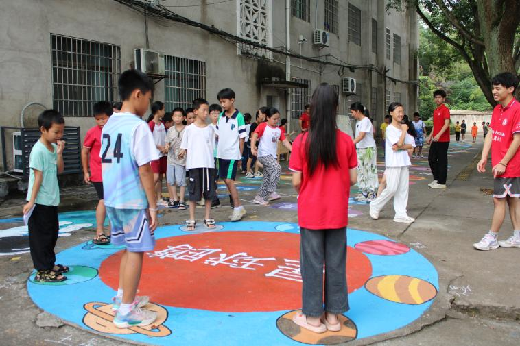 为了拓宽乡村孩子们的视野,让他们在“玩中学”“学中玩”,团队在近尾洲联合中心小学的校园里举办了“脑洞实验室 趣玩嘉年华”主题科普节,活动设置了“实验体验区”和“趣味游戏区”,实验“谁吹大了我的气球”“熔岩灯”“火焰掌”吸引了孩子们的围观,实验体验、原理理解、知识问答,孩子们畅游在科学的王国。在校园的一角,团队为孩子们绘制了约250平米的多巴胺科普乐园,这里也是科普节当天的 “趣味游戏区”,孩子们一边玩“国土拼图”“登录星球计划”“迷宫连连看”等游戏,还可以制作非遗“漆扇”,校园沉浸在一片欢乐的海洋。