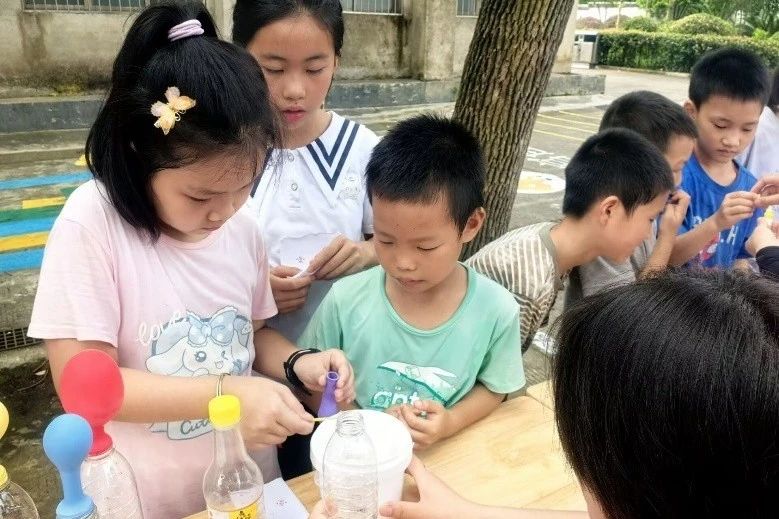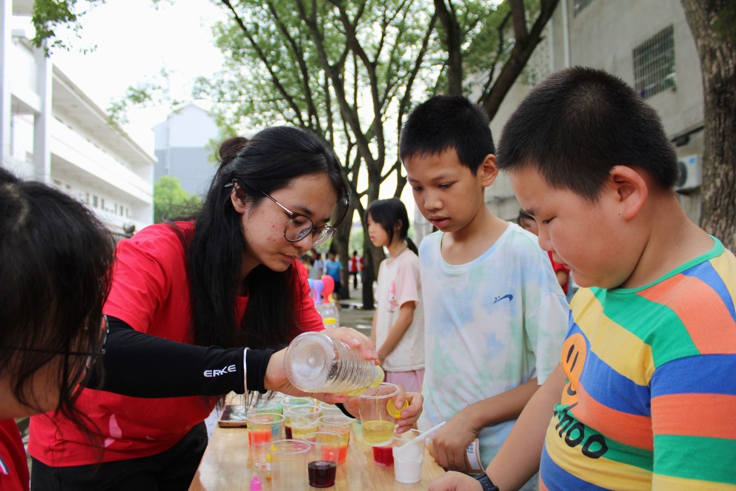 7月13日,太阳成集团122ccvip“铜”心“碳”索科普队在近尾洲联合公司中心小学举办了一场以“脑洞实验室,趣玩嘉年华”为主题的科普节,孩子们在沉浸式、互动性的科学体验活动中,走进了科学世界,一个个颜色艳丽、现象明显的小实验吸引了孩子们的积极参与。