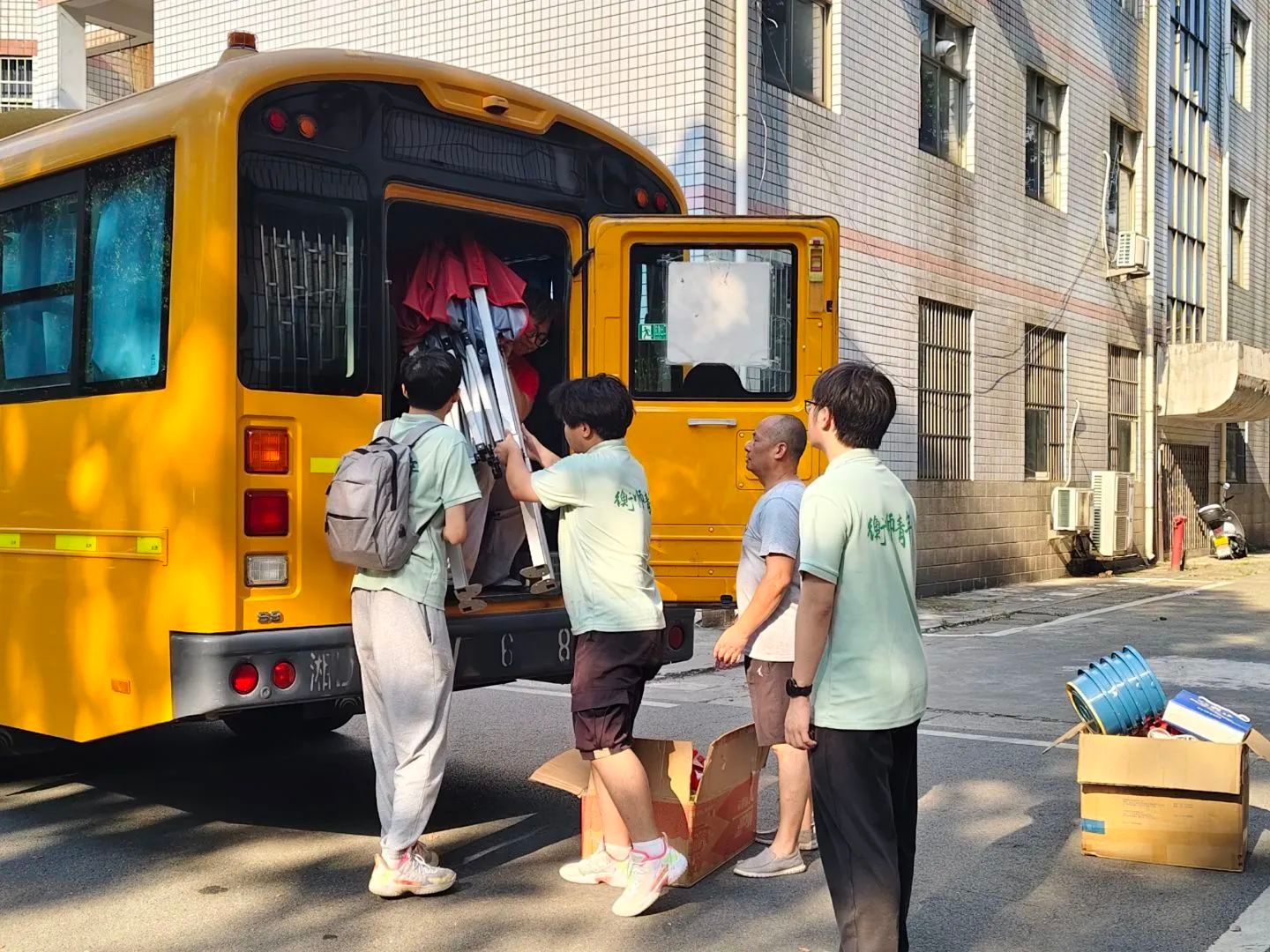 沉重的行囊卸下肩头,是科普征程的起点。不论是中心小学略显熟悉的校舍,还是蒸市初级中学崭新的环境,迎接队员们的首要挑战,都是将堆积如山的“家当”——装满瓶罐仪器的物品箱、沉甸甸的生活物资进行搬运、归置。汗水迅速浸透了科普队队员的队服,队员们肩扛手提的身影在楼道、教室间穿梭。“小心,这边抬一下!”“实验器材放这里!”简洁的指令与默契的协作,早已将两支队伍的心拧成一股绳。