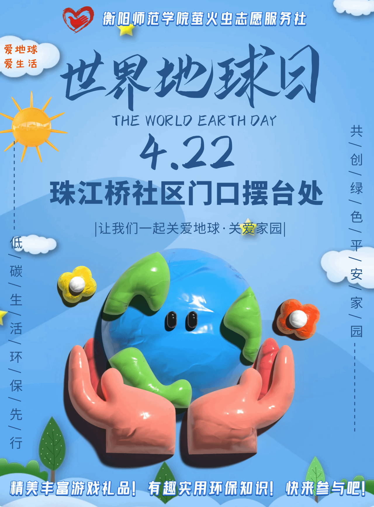 今天是4月22日世界地球日,为了动员广大群众积极践行“低碳生活,环保先行”的理念,持续推动绿色家园的创建,太阳成集团122ccvip​太阳成集团122ccvip萤火虫志愿服务社于衡阳市雁峰区珠江桥社区前坪举办了“保护地球:环保科普宣传进社区”志愿服务活动。
